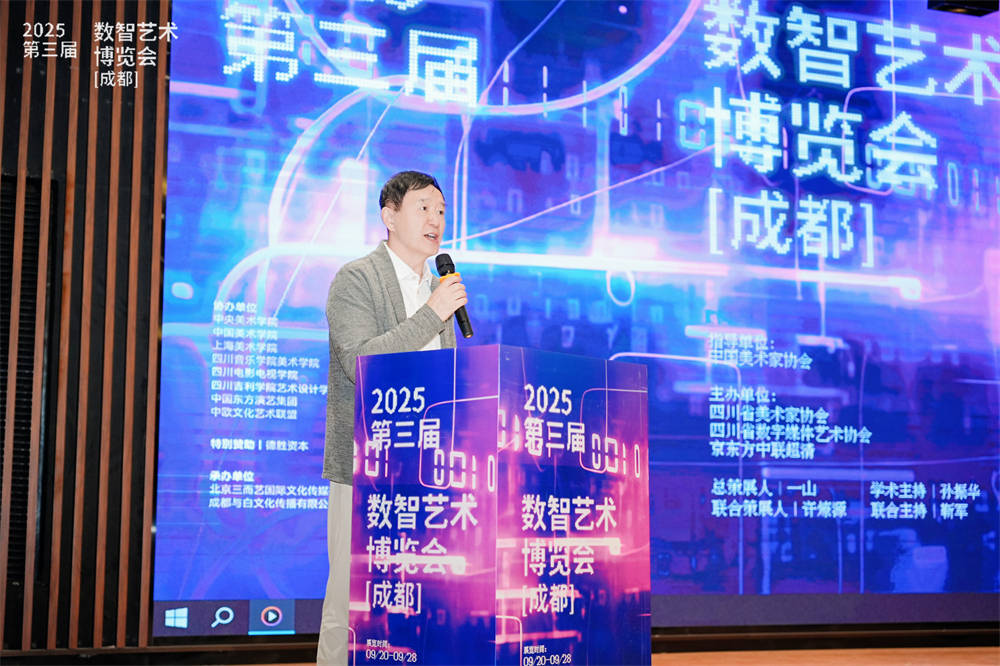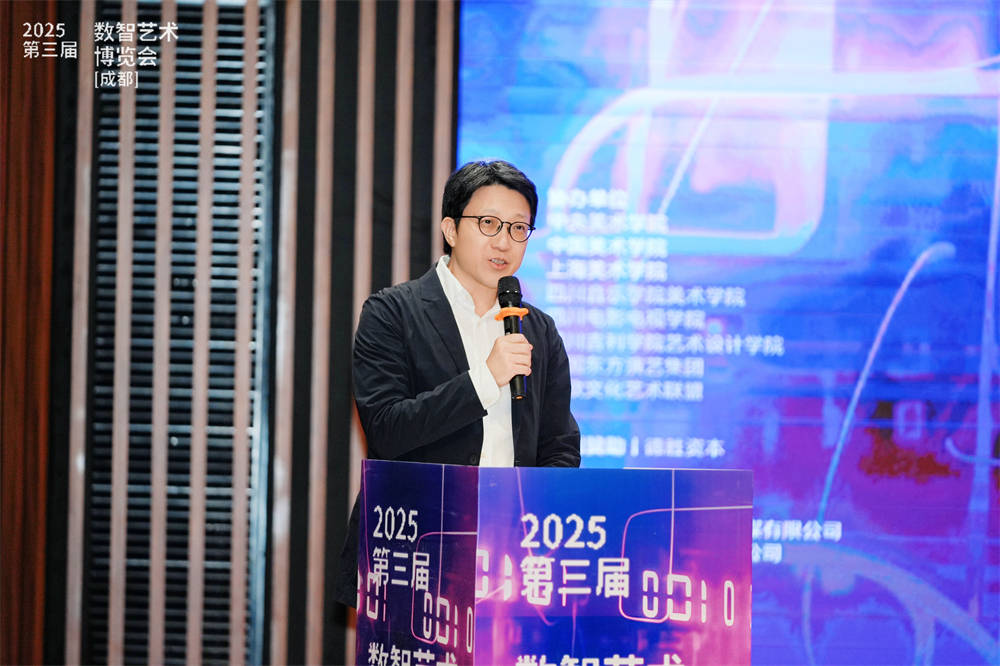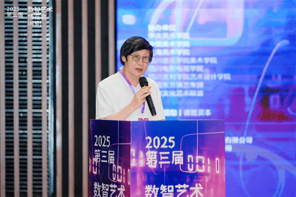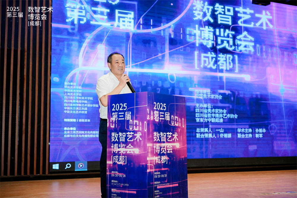 开幕式上,多位行业重磅嘉宾致辞。四川省美术家协会名誉主席梁时民指出,数智艺术突破传统框架,贴合时代发展趋势。他从 “技术与观念联动”“文化与表达开放”“创作到产业转化” 三方面强调,本届展会践行文化数字化战略,助力四川成为文化与科技融合实验区,为本土文化活化与产业培育指明方向。