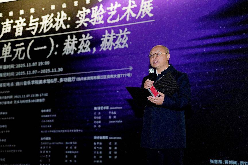 11月7日“声音与形状:实验艺术展”于四川音乐学院美术馆正式开幕。本次展览由四川音乐学院主办,四川音乐学院美术馆、四川音乐学院成都美术学院承办。作为“天府国际·砚山艺术季·第七季”的重要展览之一,展览第一单元“赫兹,赫兹”邀集了14位国内外声音艺术领域的知名艺术家与学者,将前沿的作品展演与深度的学术研讨熔于一炉。展览呈现了声音艺术所分化出的声音采样、自由即兴、声音图景、噪音绘画等丰富的面貌,提供了声学空间、非线性时间与叙事的多元表达。