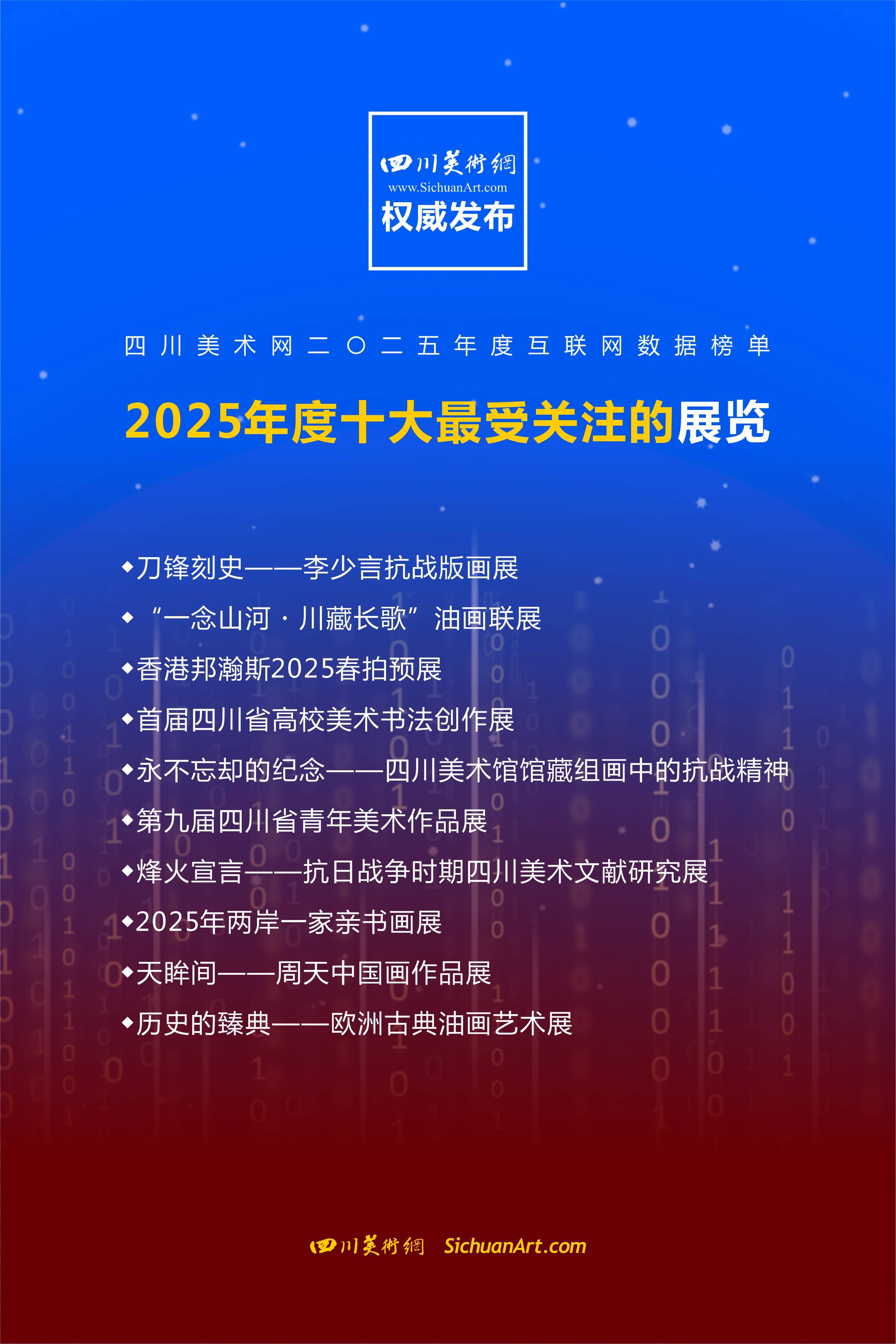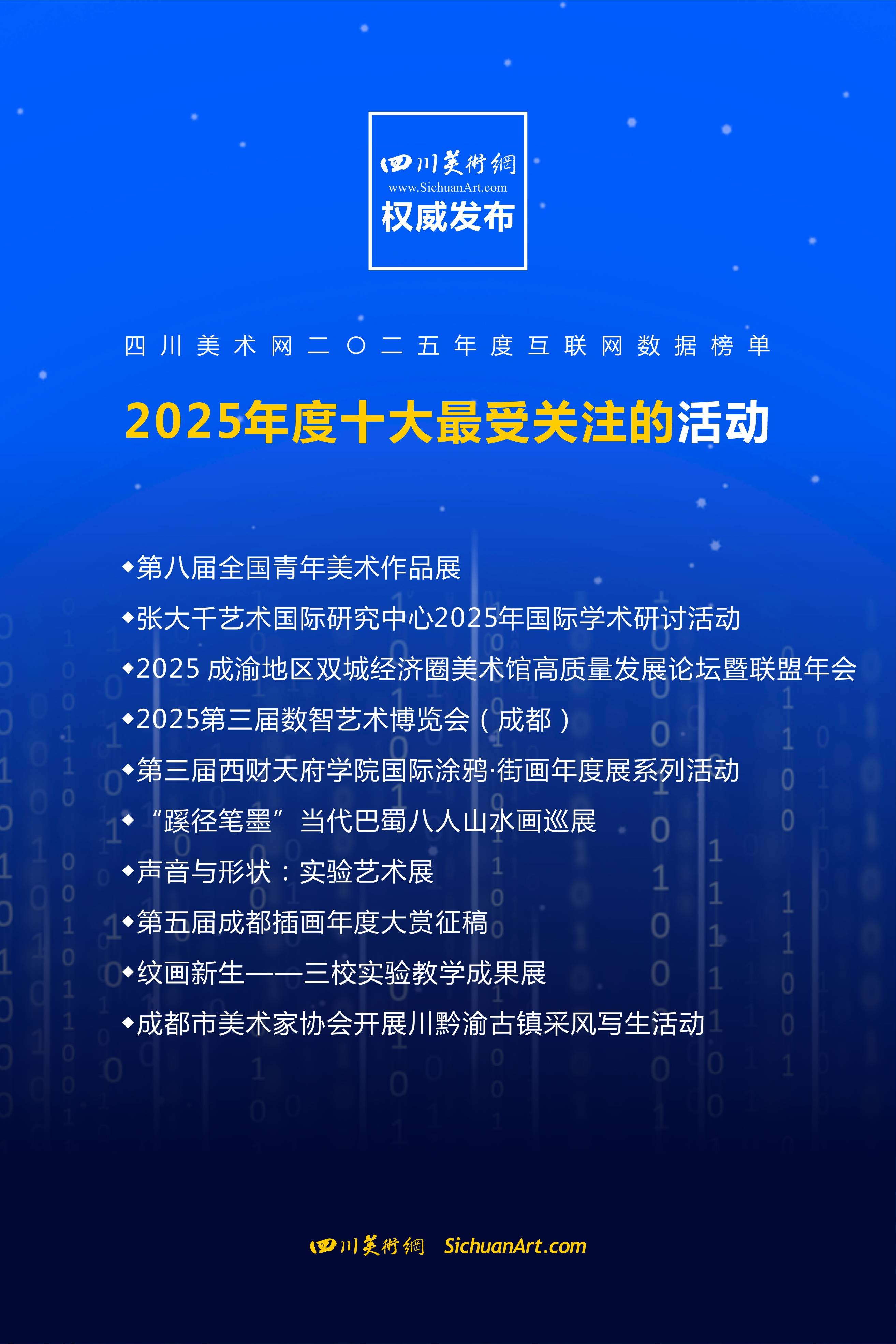 为全面梳理2025年度四川美术网平台脉络,精准捕捉四川美术领域热点趋势,今日,四川美术网正式发布2025年度互联网数据榜单。经过平台全年用户浏览、收藏、分享等多维度数据整合分析,“2025年度十大最受关注的展览”与“2025年度十大最受关注的活动”两大核心榜单重磅揭晓。作为省内权威的美术行业垂直平台,本次榜单旨在客观呈现年度美术领域的活力与亮点,为行业从业者、艺术爱好者及社会公众提供极具参考价值的行业观察依据。